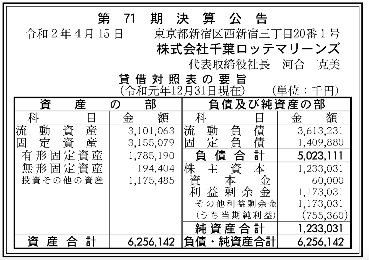 千葉ロッテマリーンズ 決算公告 第71期 官報ブログ